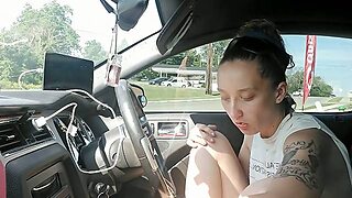 Stepmom in high-heeled slippers and brief skirt with super-sexy legs shows her pussy to her stepson in the car in public